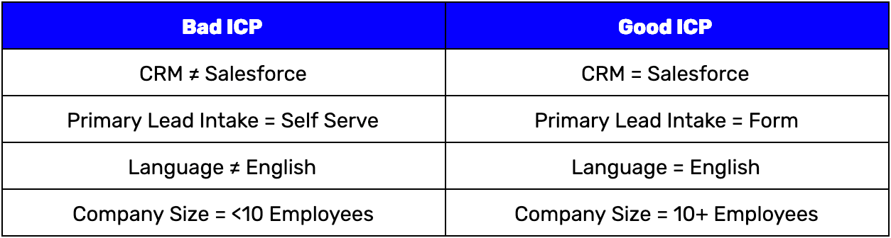 Since it’s more obvious who you can’t sell to, start with establishing what a bad fit lead is. For the time being at Chili Piper, we don’t sell to companies who aren’t using Salesforce and who don’t use a request to talk to sales form on their website. Here’s what our ICP looks like:
