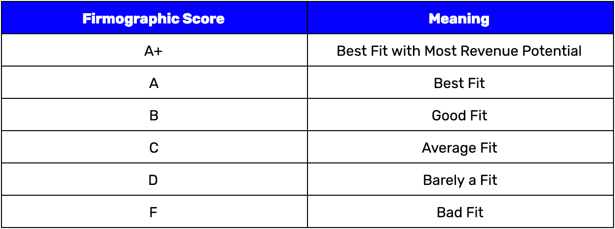 Firmographics scoring is measuring the fit of the company, similar to the ICP criteria above. Intent scoring is an attempt to measure their level of intent to buy. We recommend to keep these scores separated by using a letter grade for their firmographic score and a number grade to measure their intent.