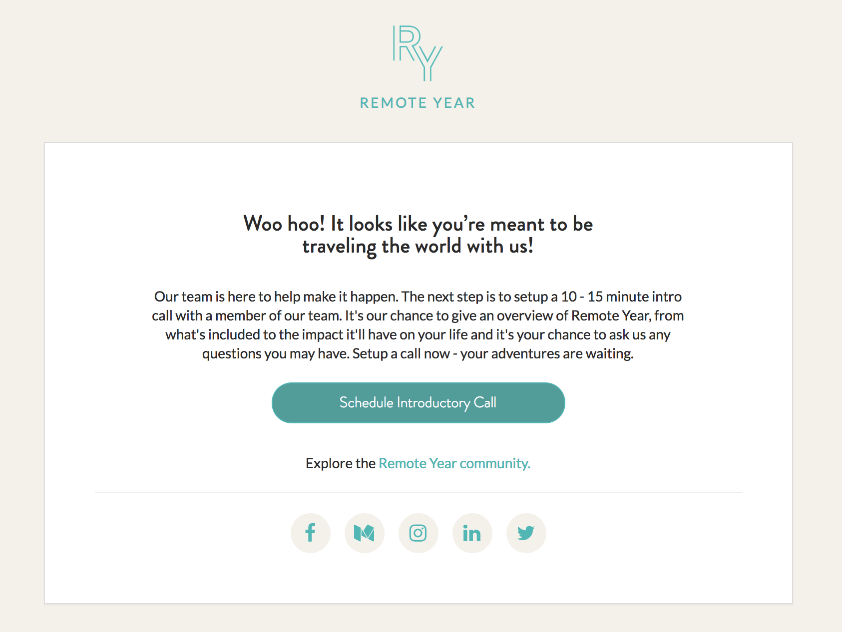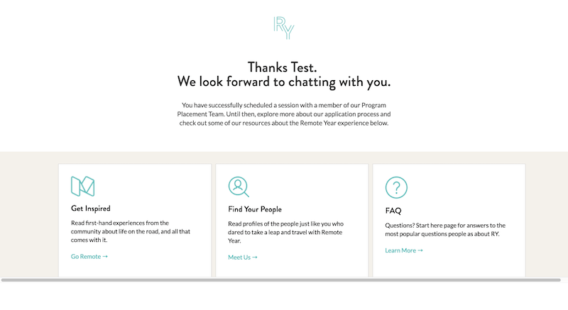 Last but not least, here’s Remote Year’s thank you page after I book time with a rep from their team: