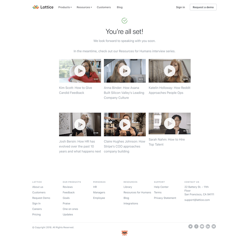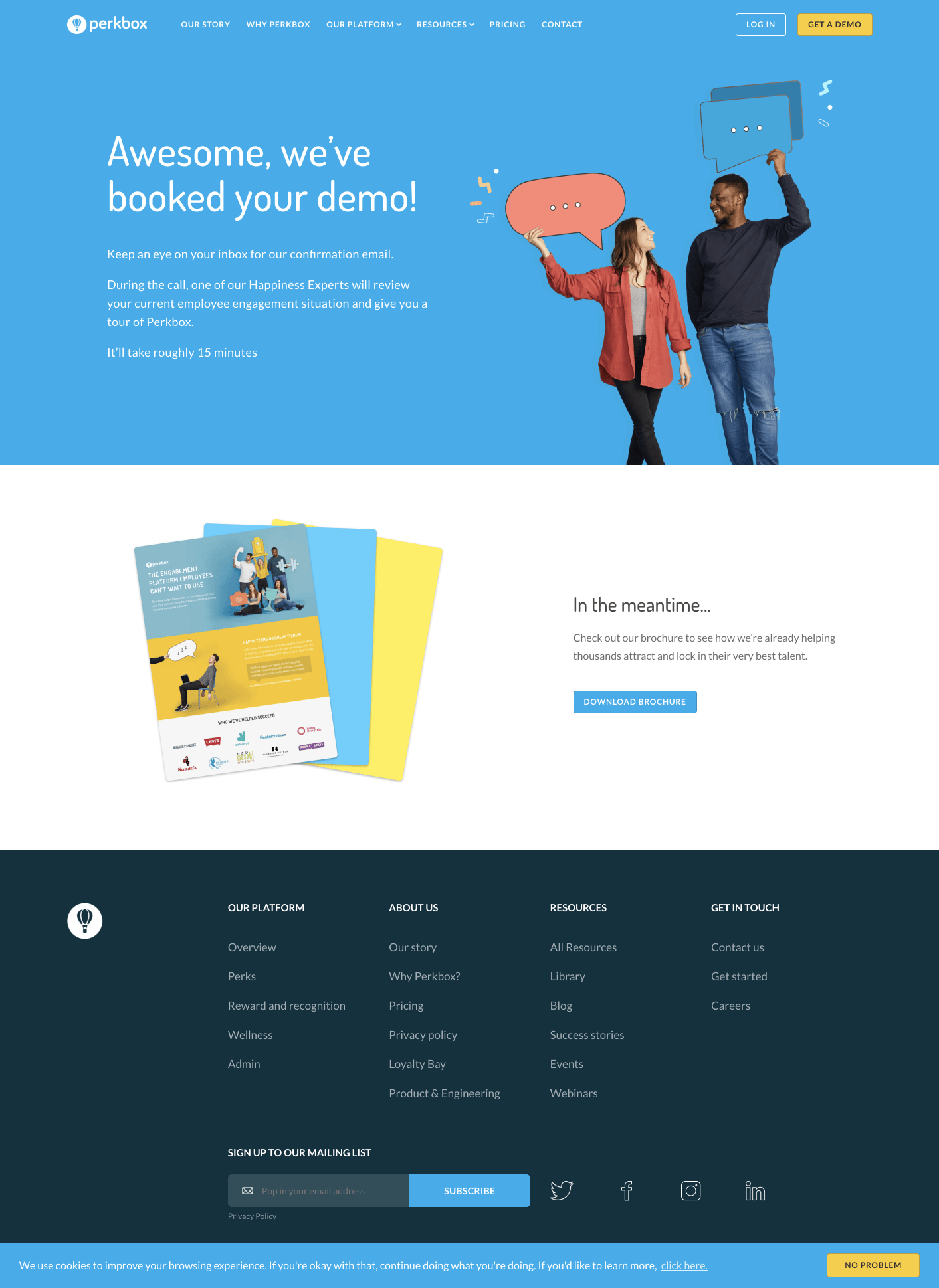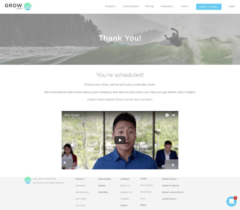 This is the thank you page I’m sent to after I book a time to get a demo:
