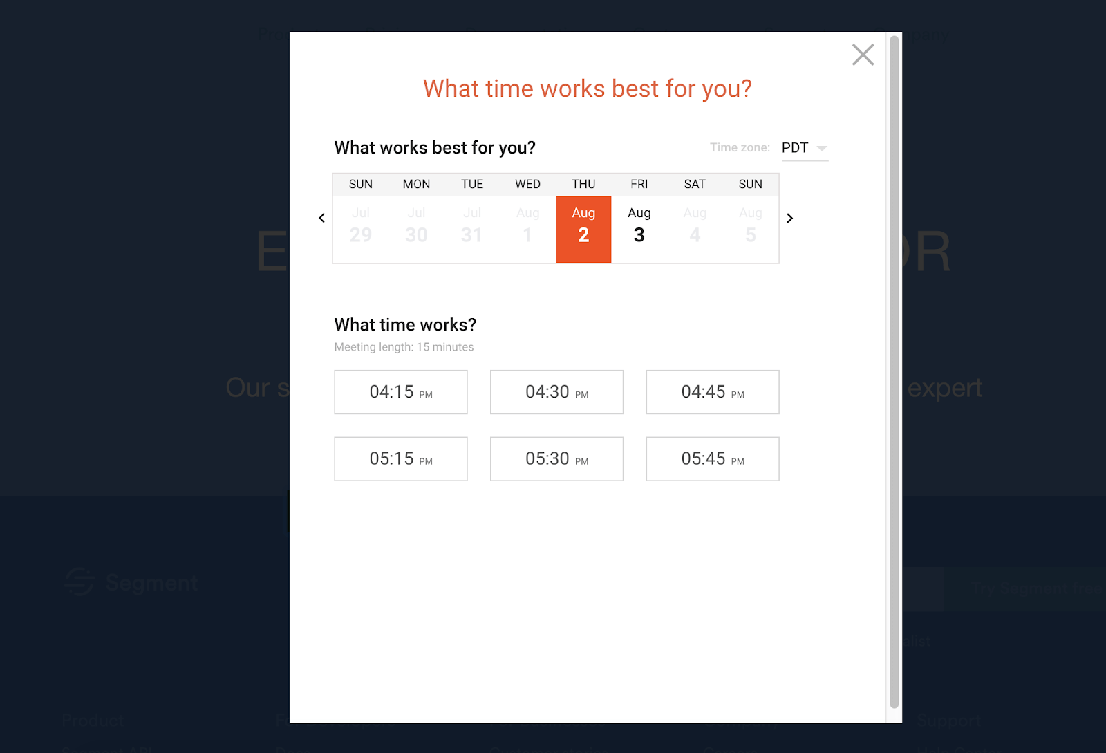 Then when I click on “Book Time With Us”, Chili Piper pops up and gives me the option to book a meeting with a Segment expert: