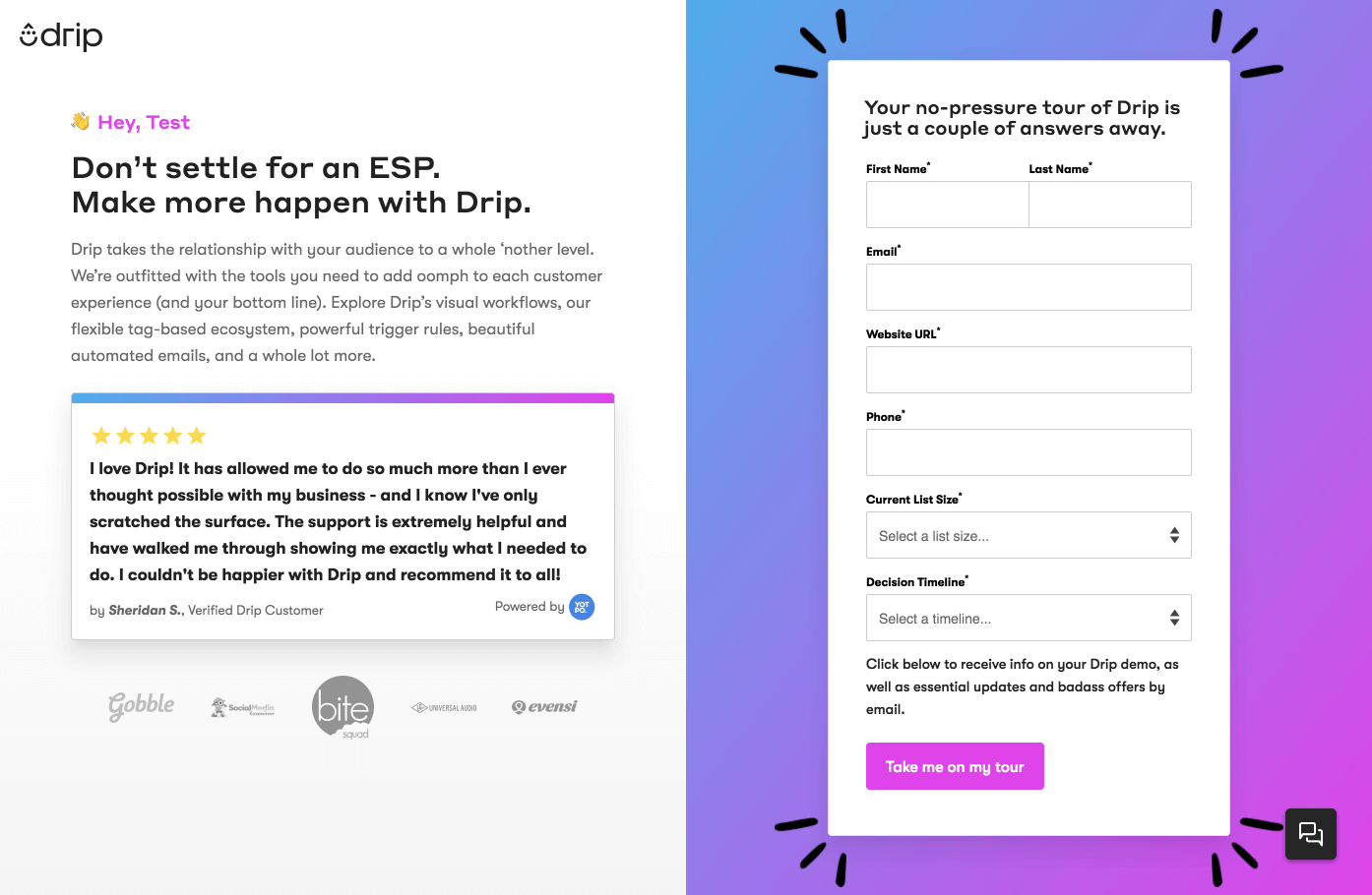 When you go to Drip’s website, you can either test out their platform for free or you can schedule a demo.