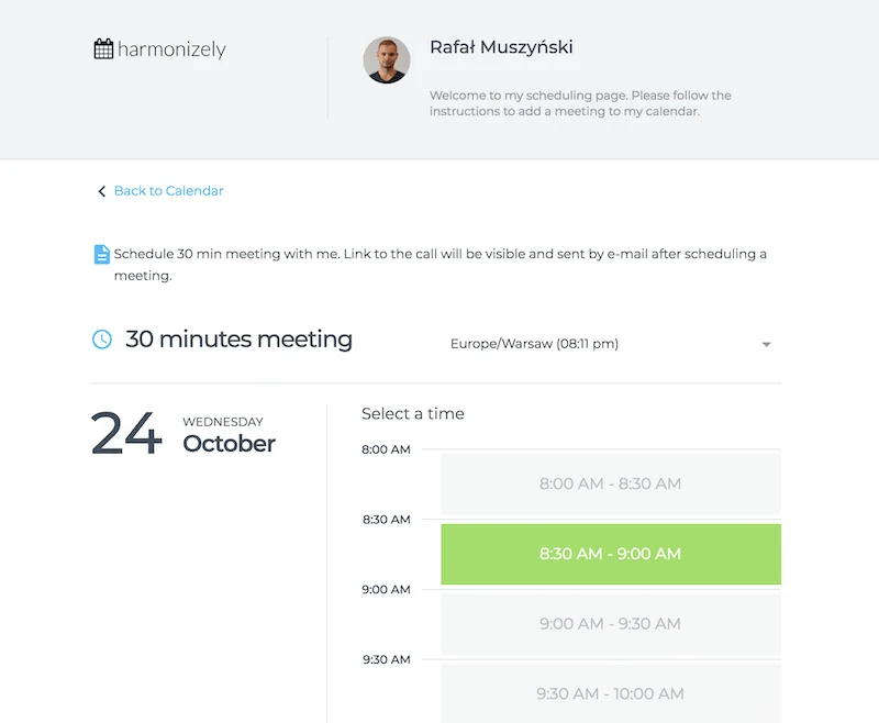 Harmonizely comes with timezone detection, and the scheduling page is available in several different languages, including English, Italian, German, and French.