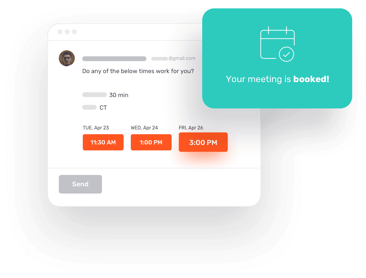 We’re all familiar with the exchange on the left. You send an email with some available times to meet, and then wait. If there’s a time and date that works, they respond, and then you set something up. Then you have to send a follow-up reminder. Or worse … none of those times work and the back and forth begins.