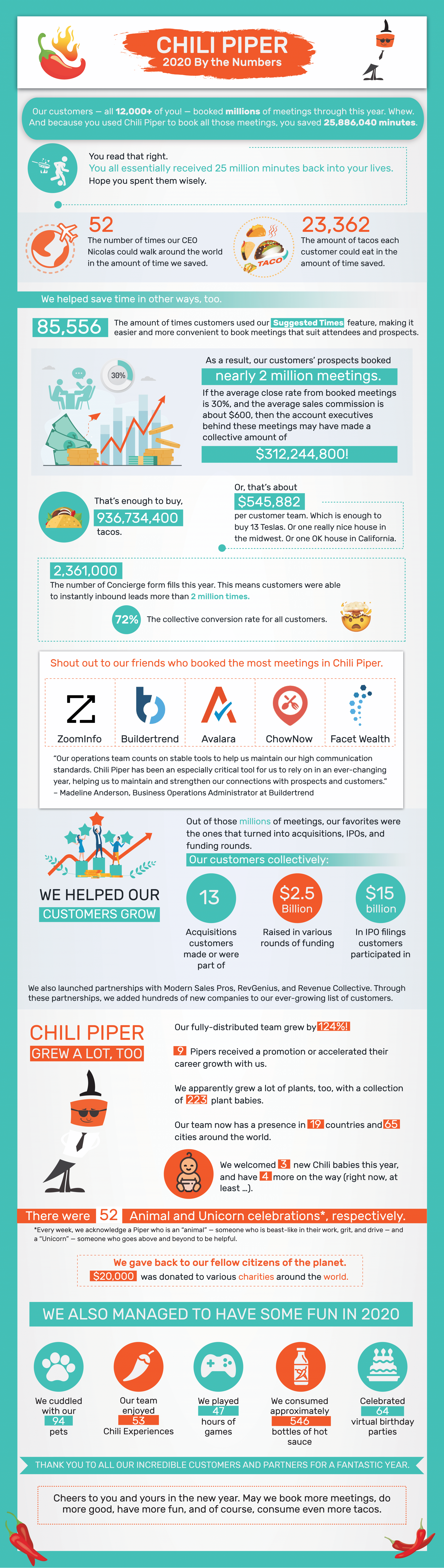 How, do you ask? Because we still found ways to gather! (Safely, of course.) Amid the challenges and hard times, we stayed connected through creative and virtual ways. And accomplishing our work, meeting business goals, and keeping in touch were made possible through the power of meetings. Here’s a look at the year in numbers for our product, customers, and team: