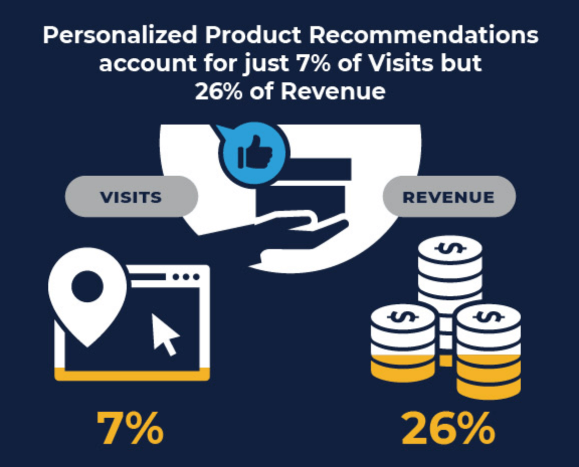 According to Stacey Rudolph of Business 2 Community, only 7% of website traffic comes from personalized product recommendations, but they account for 26% of revenue.