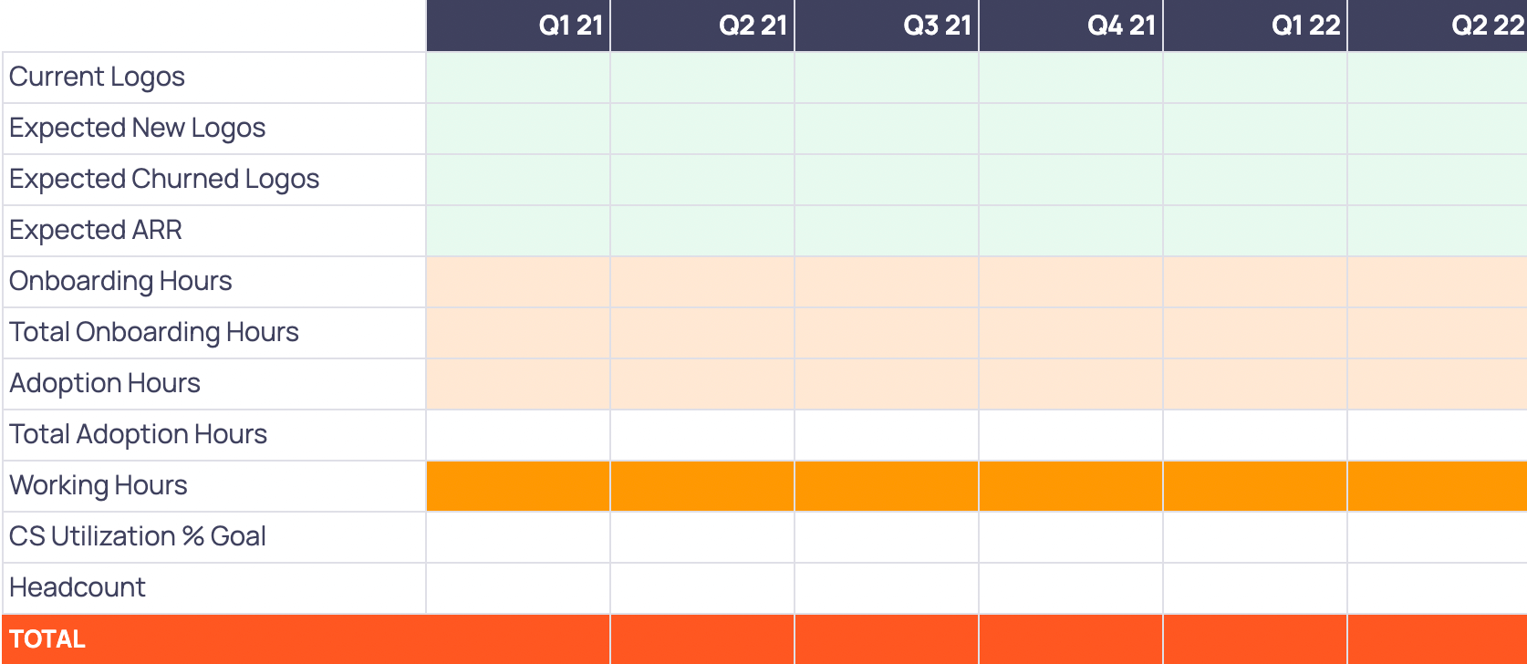 I used to update every quarter, but I realized there was often a disconnect between expected and actual new logos — so I started running the numbers with actuals once a month to make sure we were predicting CSM headcount as accurately as possible.