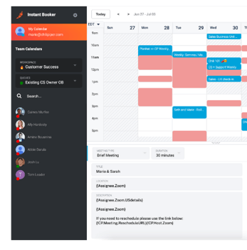 Chili Piper’s Instant Booker (depicted below) enables you to schedule meetings on behalf of your teammates, which also helps to streamline handoff.