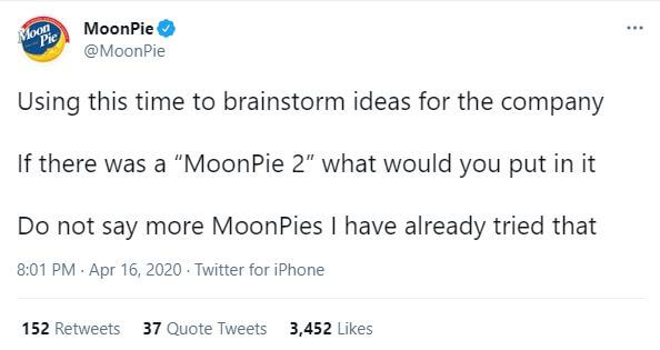 Not everyone grew up with Moon Pies, so many people probably had no idea it was a snack cake brand. Until @MoonPie hit Twitter. This is a great example of brand awareness retargeting and gaining a whole new audience.