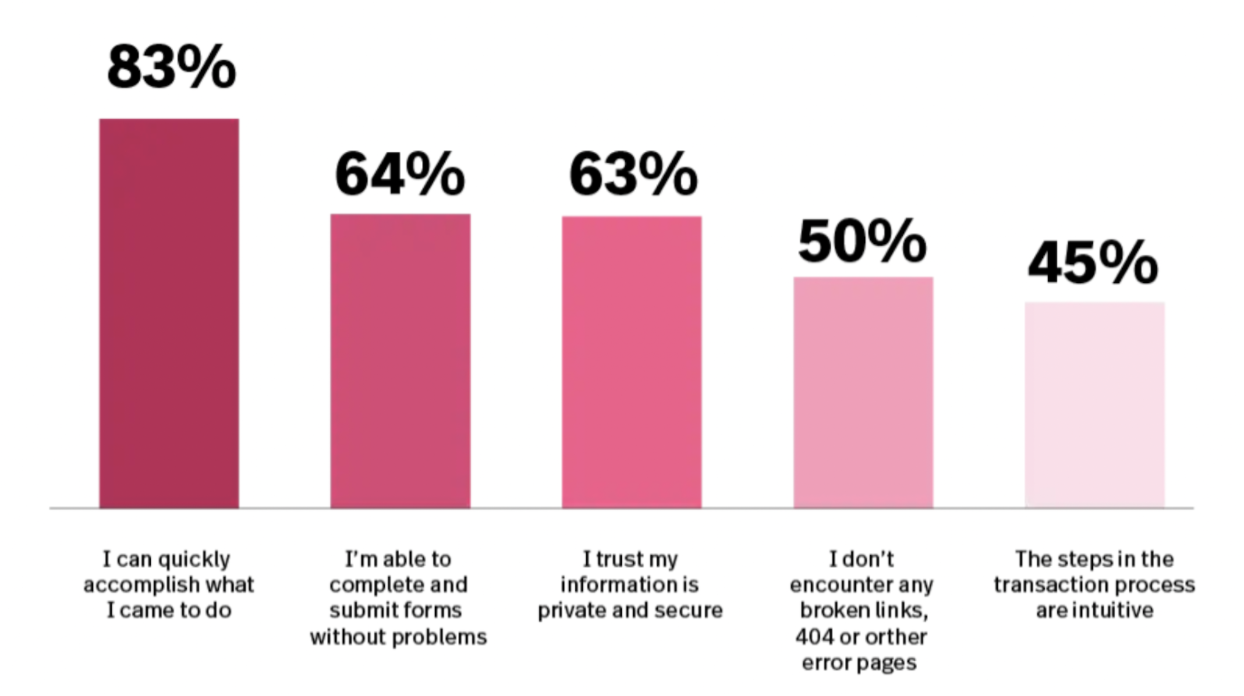 According to a survey conducted by FullStory, 83% of 1500 consumers surveyed cited, “I can quickly accomplish what I came to do,” as the most important factor in creating a good digital experience, followed by, “I’m able to quickly submit forms without problems.”