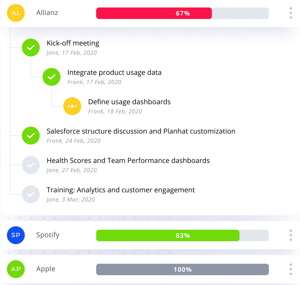 Planhat has workflows for an onboarding team to follow up with specific tasks, descriptions, and timelines for onboarding. You can seamlessly monitor which tasks are on track, which are behind, and can assign customers to CSMs fairly via automation.