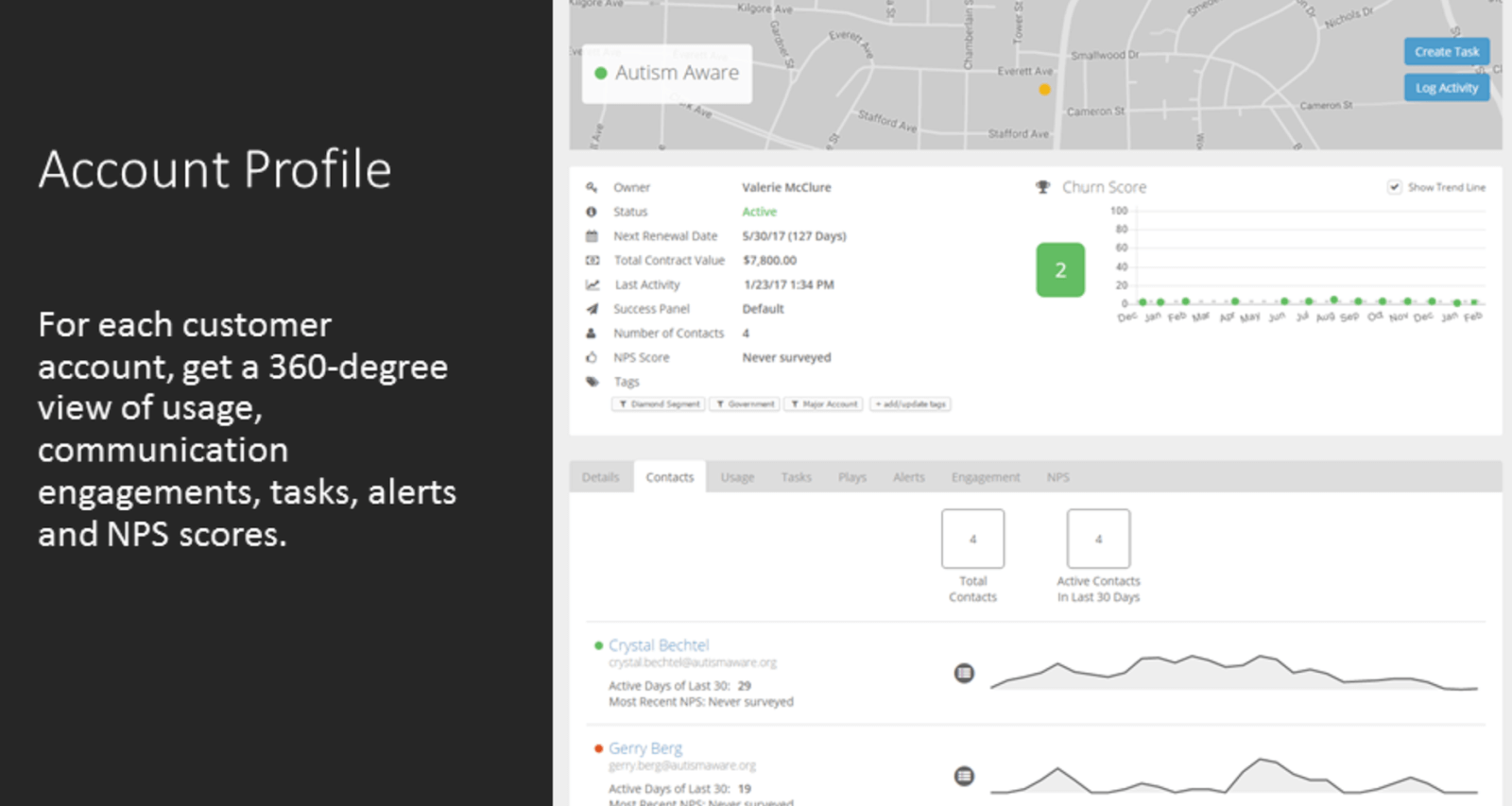 In our assessment, ChurnZero scored highest in our customer health score category. They generate “churn scores,” and they are 100 percent customizable with no limitation to the number of scores you can create.