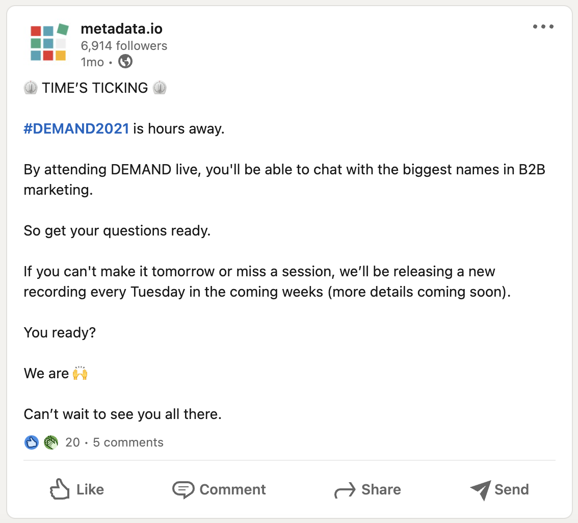 From their one-day event, Metadata will have years worth of content to repurpose –– just check out their website to see what you missed at DEMAND. They’ll be able to do write ups, a ton of social media posts, and blog posts.