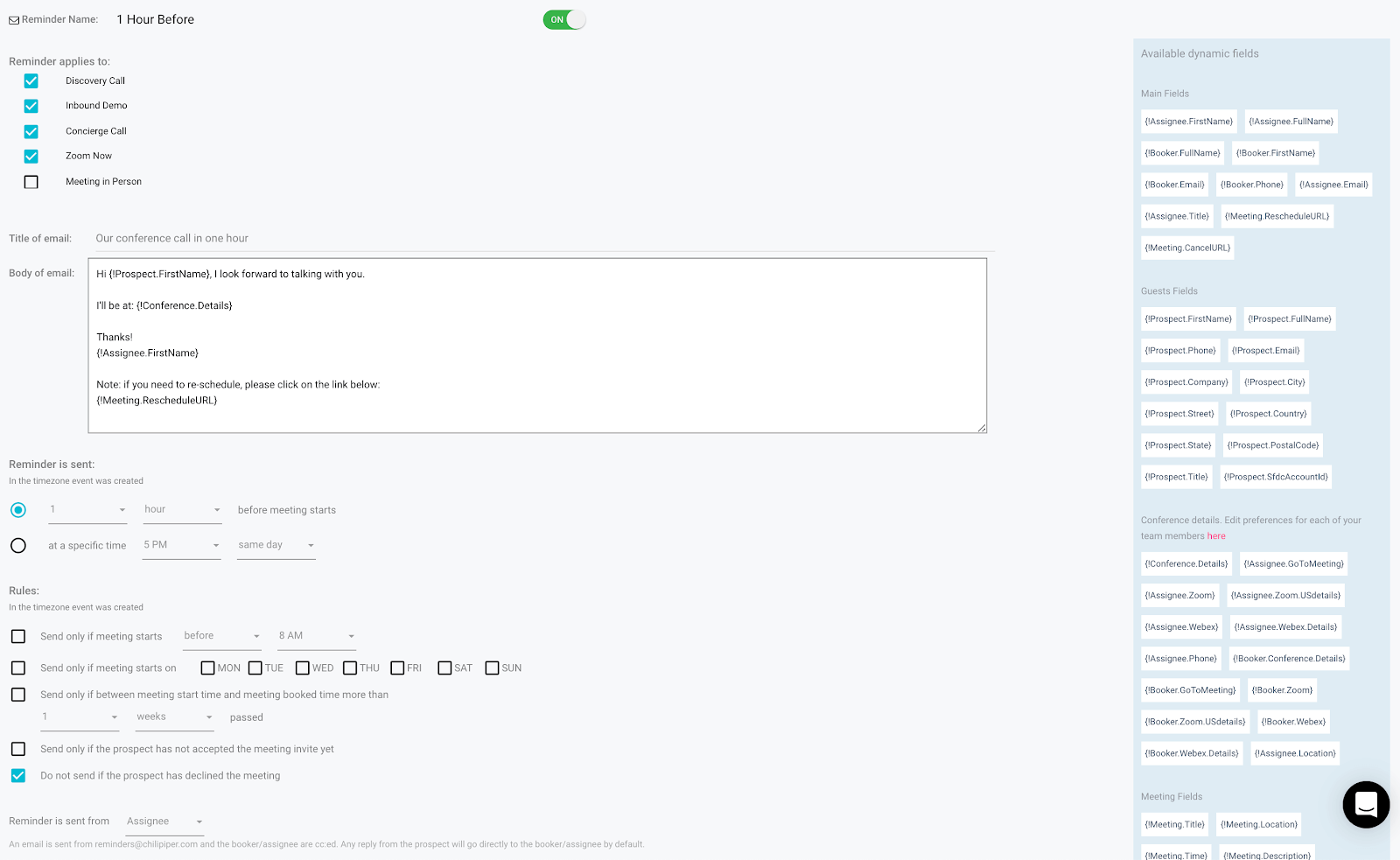 We recommend sending three distinct reminders at the following times: 24 hours prior to meeting, one hour prior to the meeting and one minute prior to the meeting. This cadence actually helped Chili Piper achievean outbound no-show rate of ~10%.