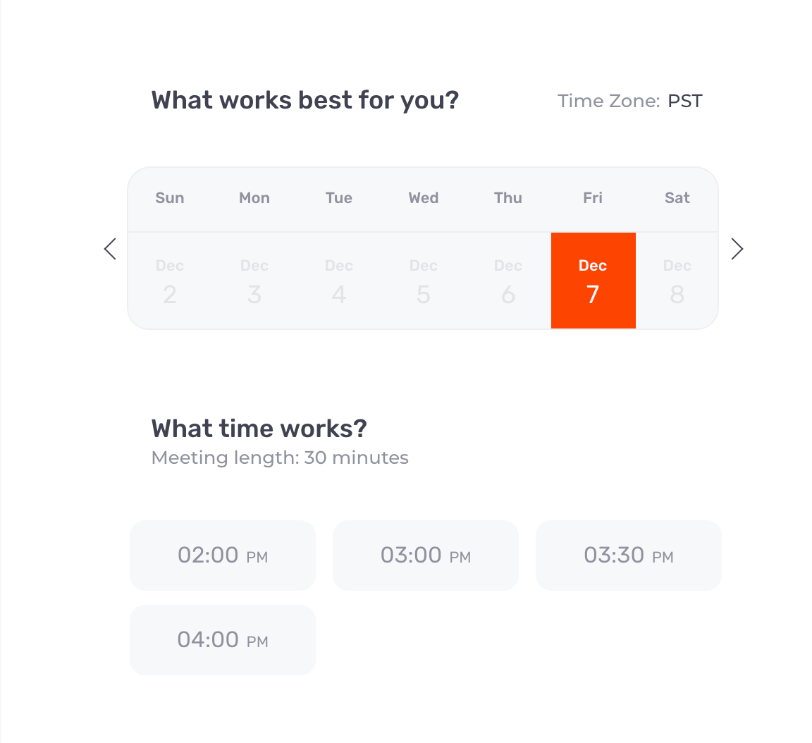 Here’s an example of a booking calendar in Chili Piper, aligning your visitors’ availability with that of your sales reps. The calendar only populates available times based on your reps’ availability so everyone’s online schedule is on the same page.