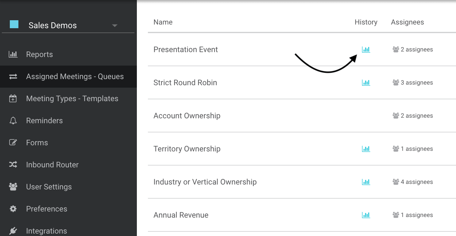 Here’s a snapshot of the assigned meetings dashboard in Chili Piper, showcasing specific types of presentations, how many attendees are in your queue, and how those meetings are performing.