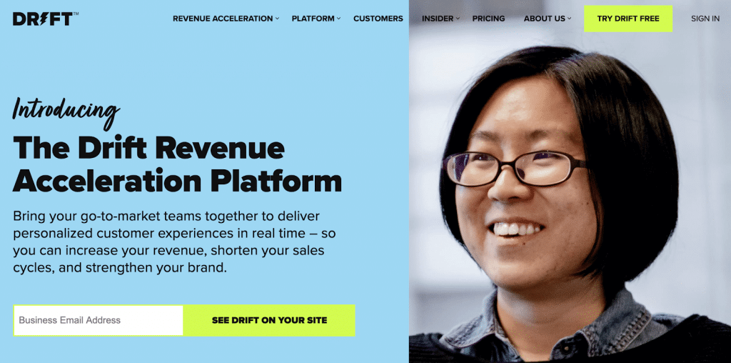 Drift only uses yellow in two places, and both are calls-to-action they want their visitors to take.