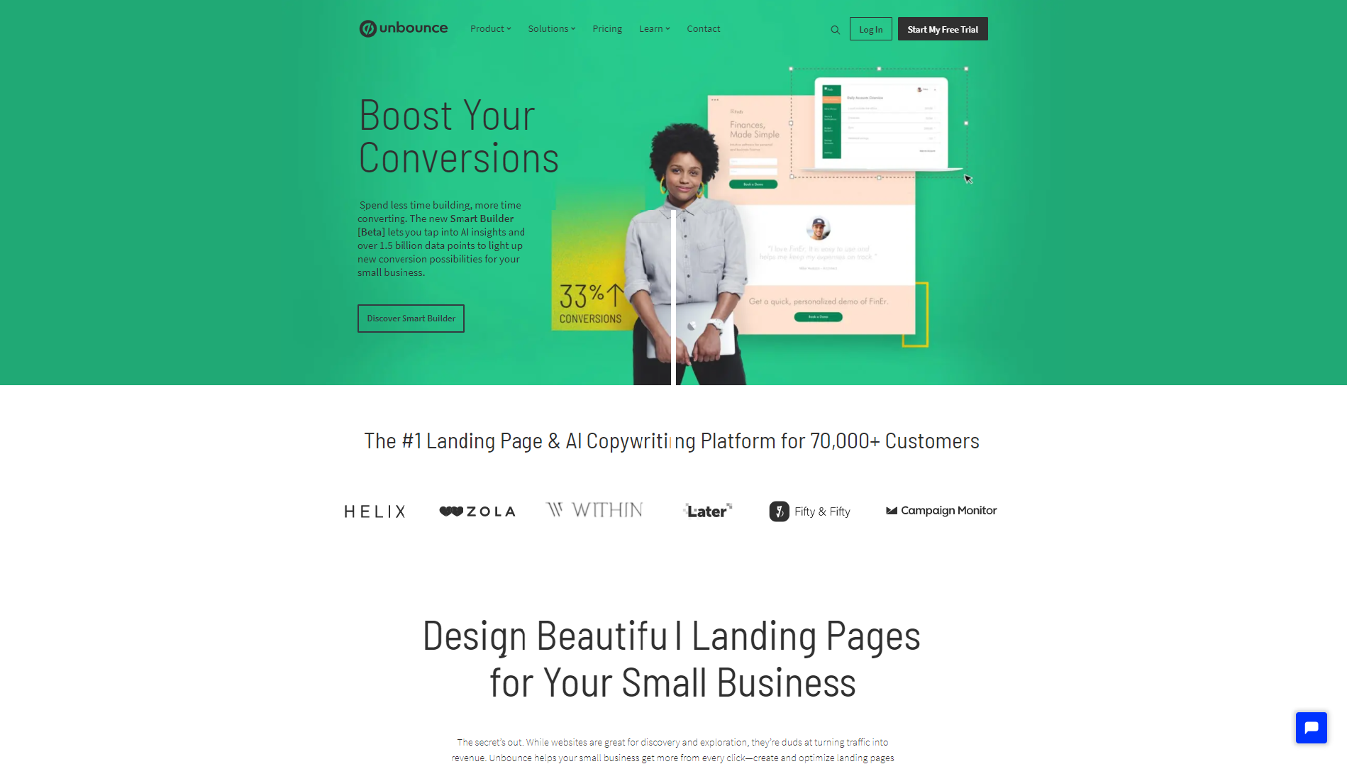 You can use its comprehensive drag-and-drop interface to customize landing page designs and conduct A/B testing of multiple versions of the same landing page. Unbounce’s library includes more than 100 mobile-optimized landing page templates, which simplifies creating landing pages.