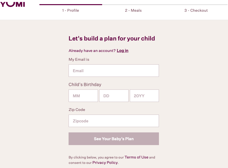 Yumi enables parents to create healthy meal plans for their baby. Its multi-step lead capture form involves several steps to collect the visitor’s contact information and details about their child.