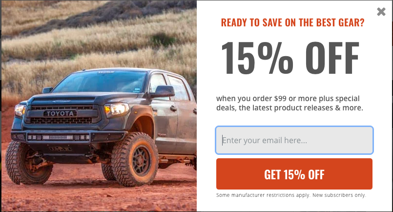 AutoAnything sells car parts online. They use a pop-up lead capture form that provides a coupon to visitors in exchange for their email address.