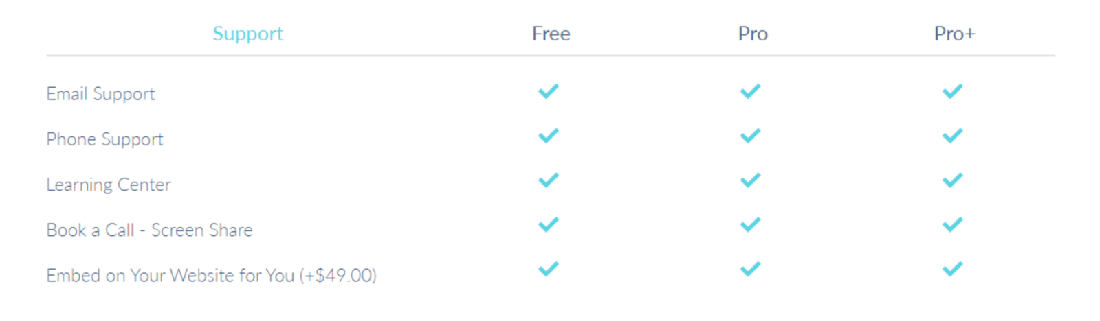 That said, Bookafy gives free users the same level of support that they give paid users through email, phone, a learning center, and book a call.