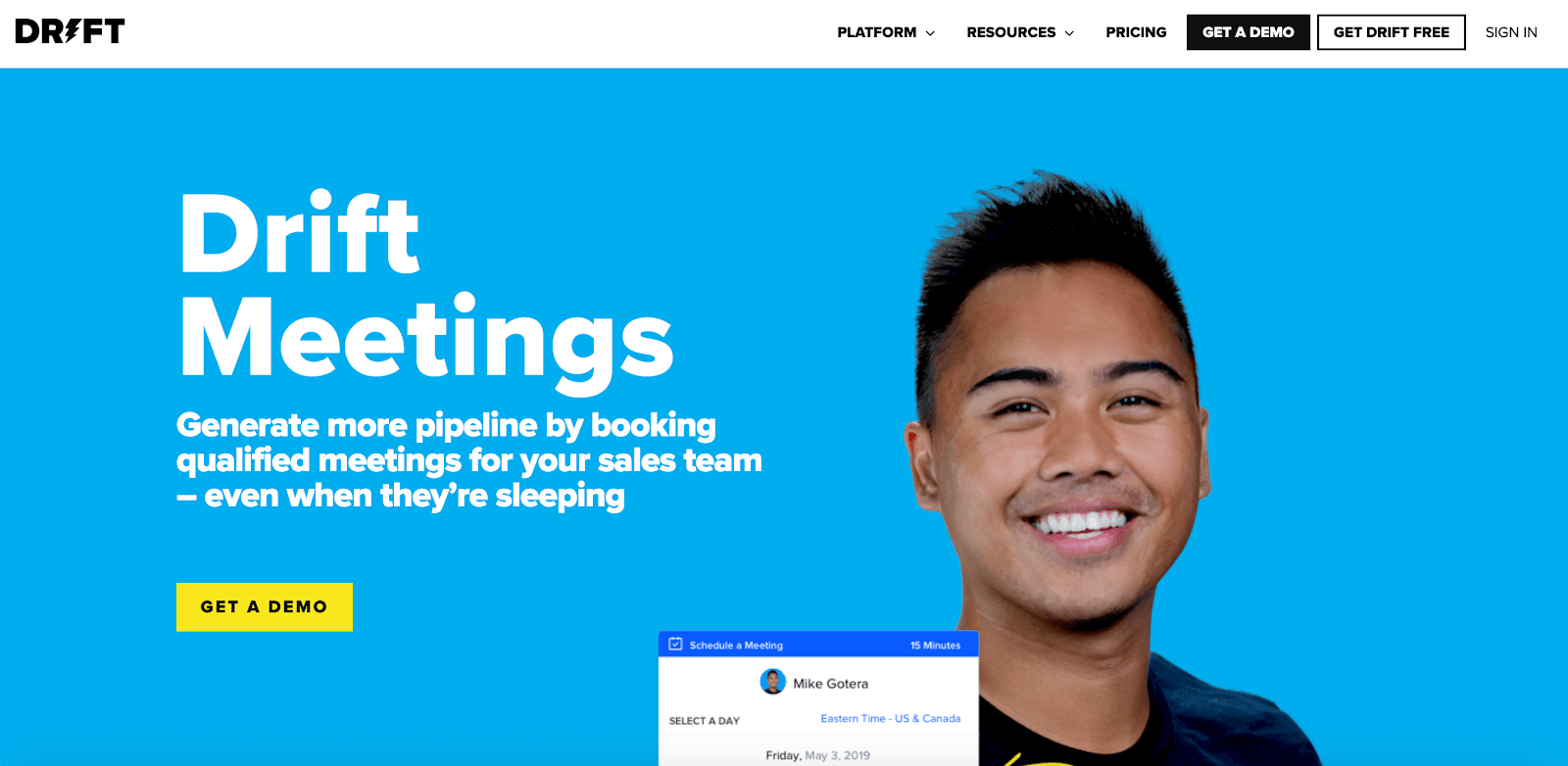 “Generate more pipeline by booking qualified meetings for your sales team — even when they’re sleeping,” is the UVP of Drift.