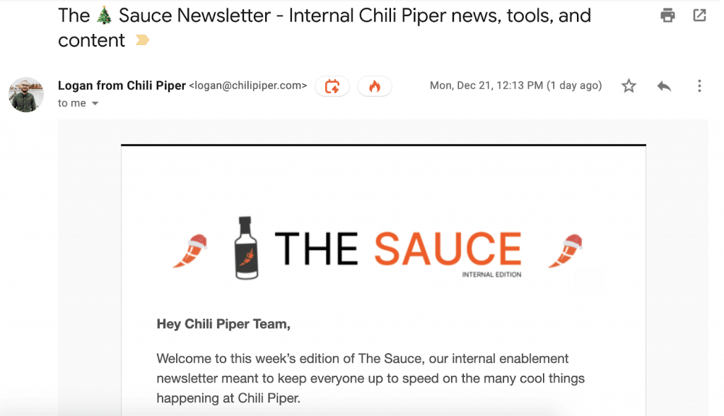 Chili Piper has an internal newsletter we send via Slack and email every Monday. It includes content like customer wins, product announcements, marketing updates, and key metrics.