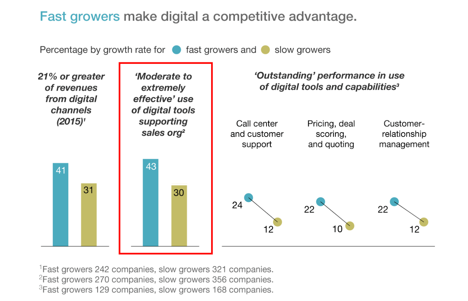 “Fast-growing companies are more effective than slower-growing ones at using digital tools and capabilities to support the sales organization (43% versus 30%), McKinsey & Company writes.