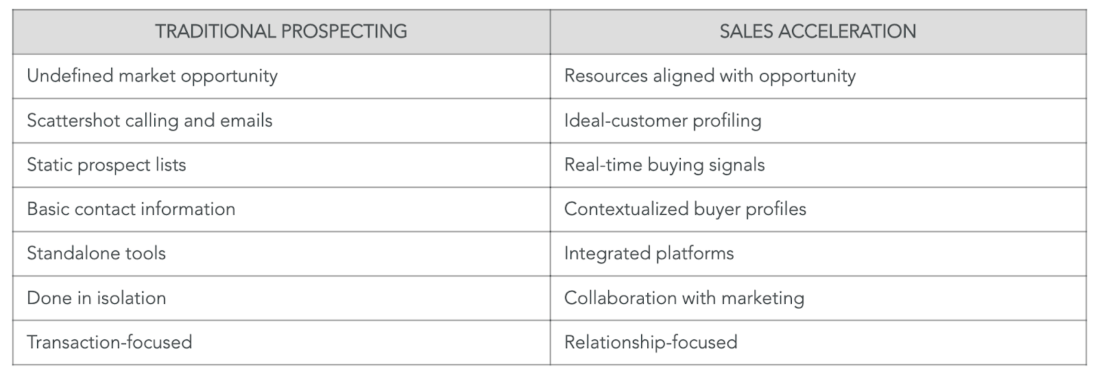 This chart from Dun & Bradstreet does a great job of highlighting the key differences between traditional prospecting and sales acceleration.