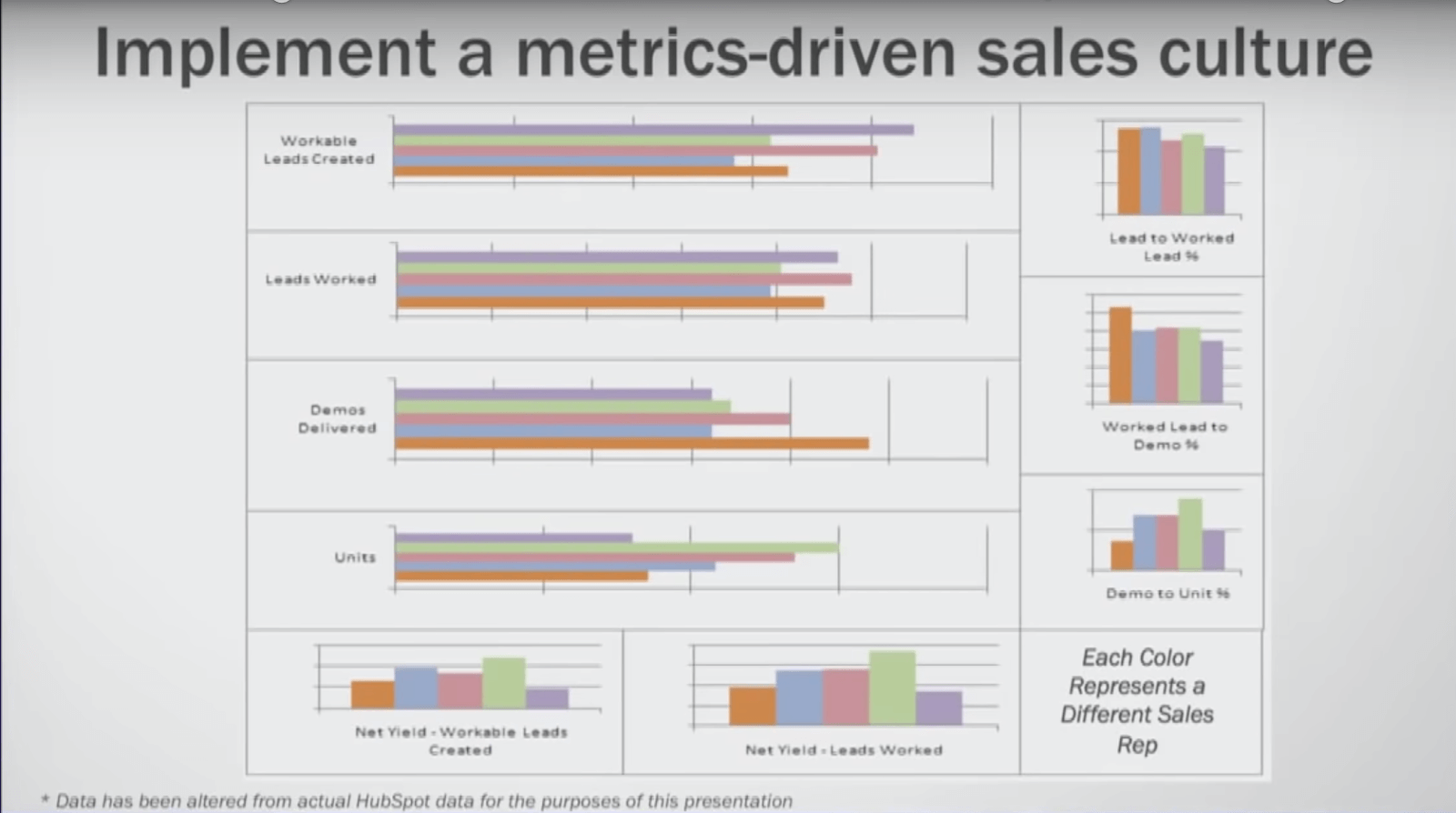 But Roberge disagrees by offering this example, where the rep who’s represented with the purple graph bar is receiving the highest volume of leads but selling the least amount of products.