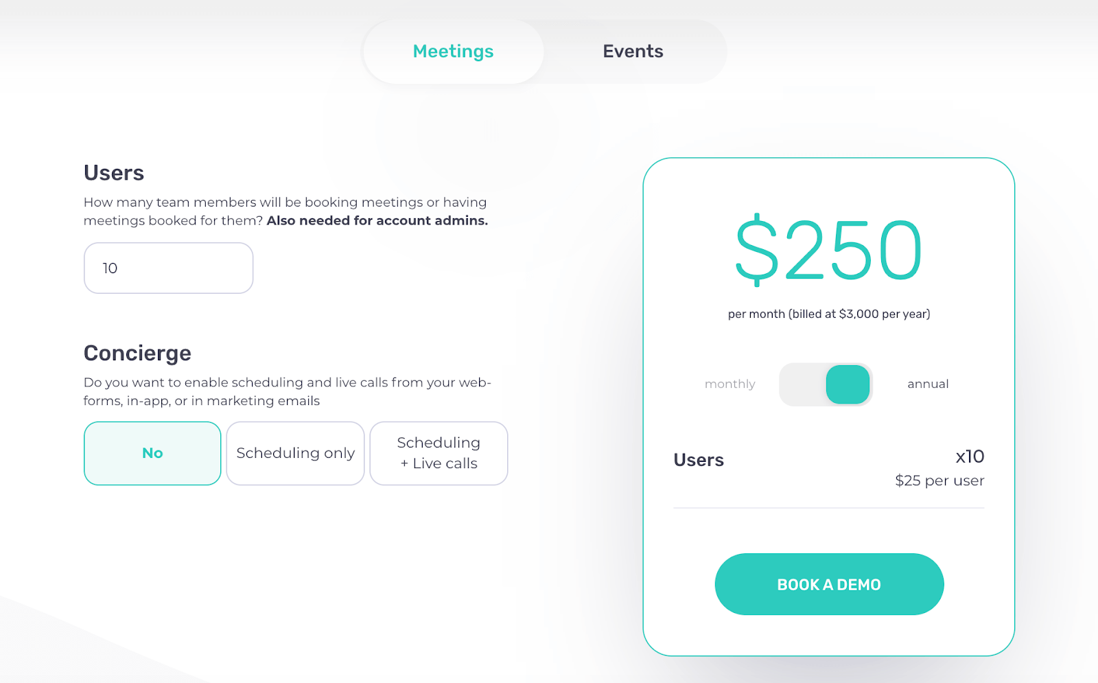 With Chili Piper, for example, closing a deal will involve a lead picking how many users they’ll have and if they want extra features likeConcierge scheduling or scheduling plus live calls.