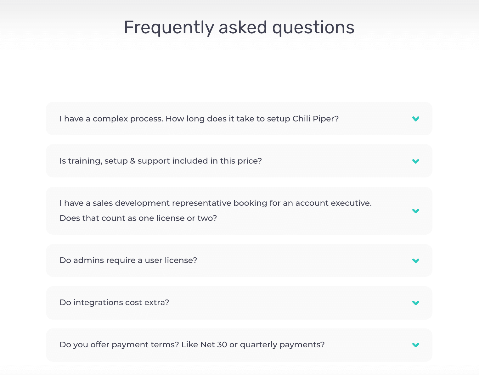 For instance, on the Chili Piper Pricing page, we have an FAQs section that succinctly tackles topics customers want to know about, such as how long it takes to set up the platform, info on training and support, how the number of licenses are calculated, and so on.
