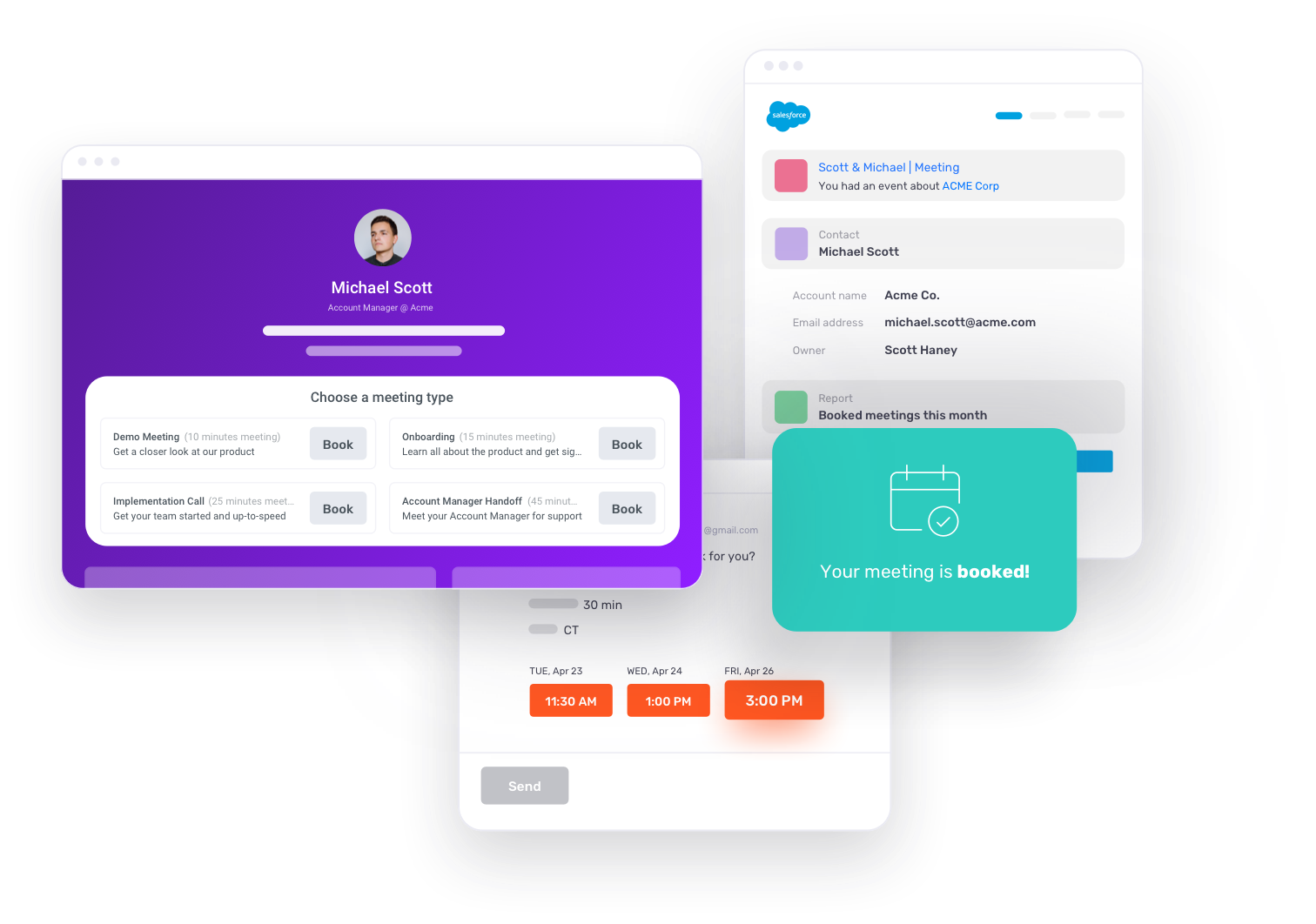 Make it easy for your customers to meet with you by booking meetings with Chili Piper’s Instant Booker. One-click booking and the Suggested Times feature make it easy for your customer to book with you at their convenience, whenever they need you. Plus, automatic email reminders help prevent no-shows, and rescheduling is a breeze.