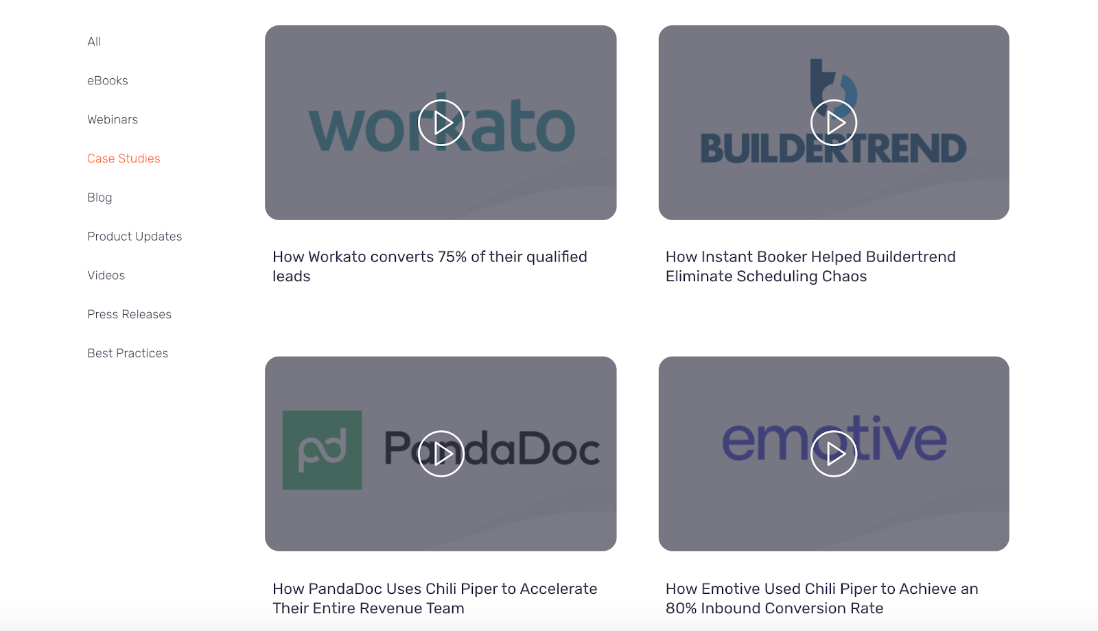 On the Chili Piper resources section, we have a page specifically devoted to case studies where we feature real-life customers and how they used our platform to grow their business.