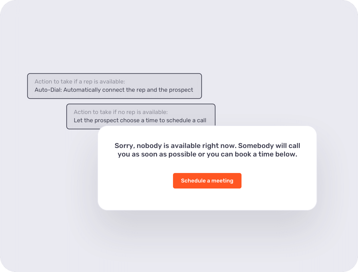 Easily configure your own rules for inbound meeting distribution. Account for vacations, off-hours, unavailable reps, and more. If no reps are free, automatically show the inbound meeting scheduler.
