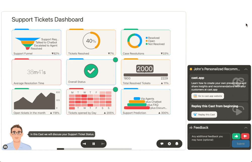 Your customers can book meetings with the right customer-facing team member, including Customer Success Managers, Account Managers, onboarding or implementation experts, and even executives from their personalized data-driven and bot-explained Cast presentations.