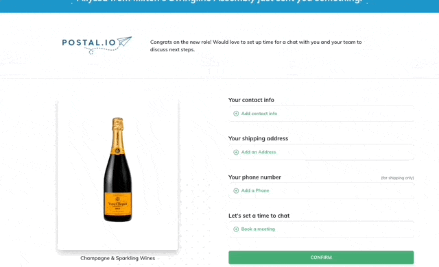 Add a Chili Piper meeting link to your Postal Gift Email or MagicLink to encourage your prospects to book time on your calendar prior to redeeming their item. This allows the recipient to view your availability and quickly book a time with you that works best with their schedule.
