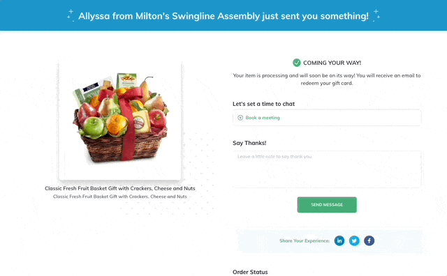 Recipients are asked to book time on the sender’s calendar before they redeem their physical or e-gift, all within one screen for their convenience.