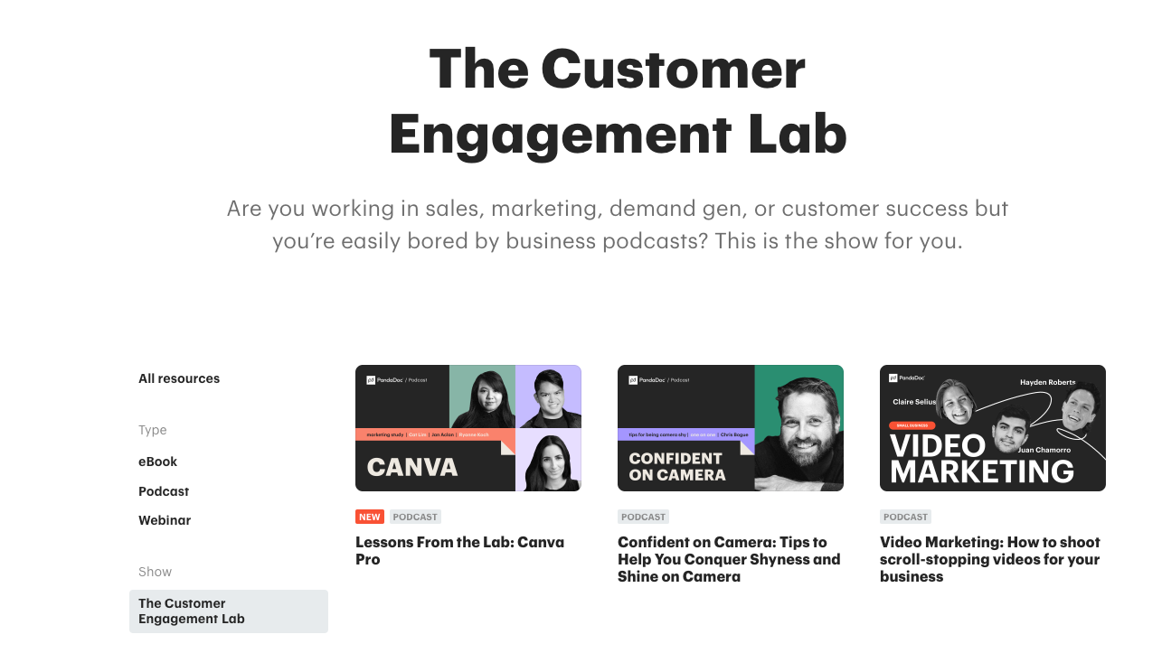 The Customer Engagement Lab podcast is hosted by our friends over at PandaDoc. They interview smart folks from cool companies who are doing things right. They touch on B2B marketing topics, but they touch on other things as well.