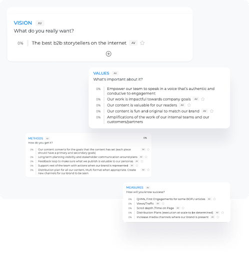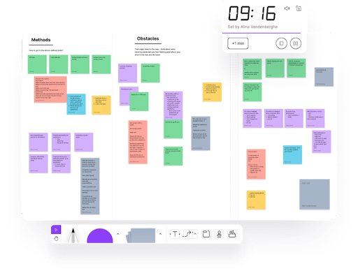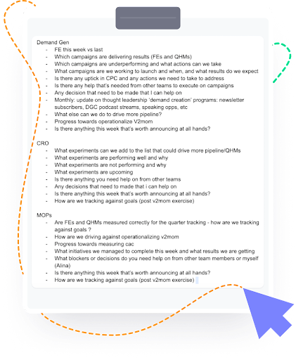 We have 8 individual teams in marketing and each one of them did a v2mom exercise (v2mom stands for vision, values, mission, obstacles, and metrics). Basically aligning the team on what’s important and what stands in the way of achieving our mission. We spent the first 10 minutes filling up the respective buckets by ourselves with a timer (we ended up using Miro for some teams and Figma for others). See below.