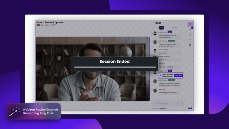 Other helpful features you should look out for are automated email reminders & signup flows, attendee engagement features (ie. polls, chat, etc.), and AI repurposing features that allow you to take your webinar content and turn it into articles, social posts, and more.