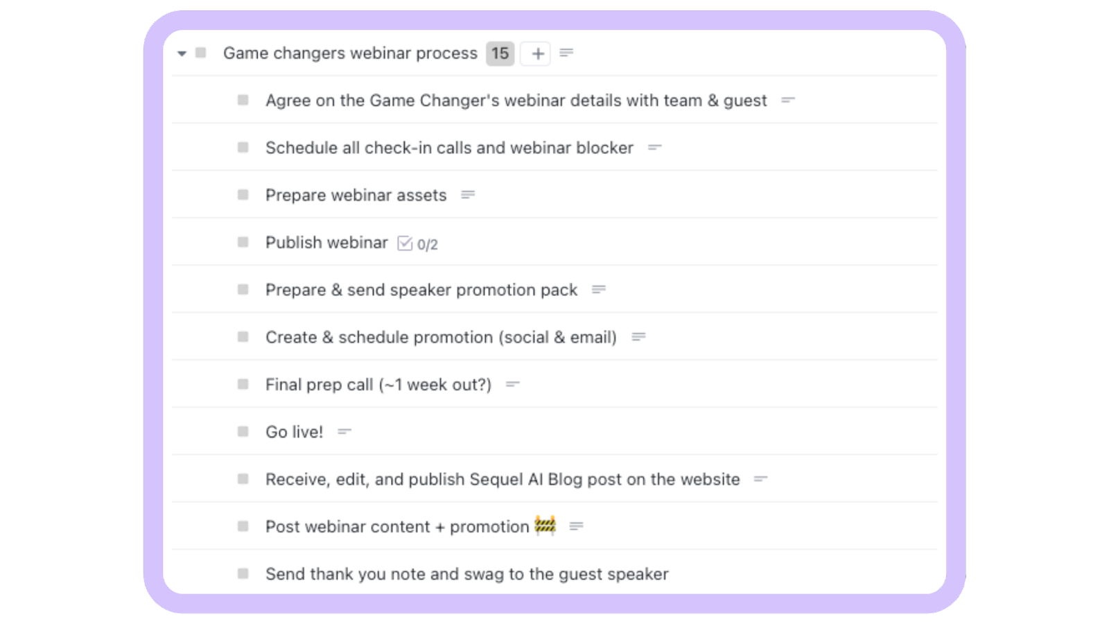 For example, my team and I host a weekly webinar series called Game Changers that brings in some of the most influential marketers in the world. Because there are events each week, we need to make sure the recurring process is 100% clear, every person involved knows their role, and the process is efficiently using automation and hand-offs.